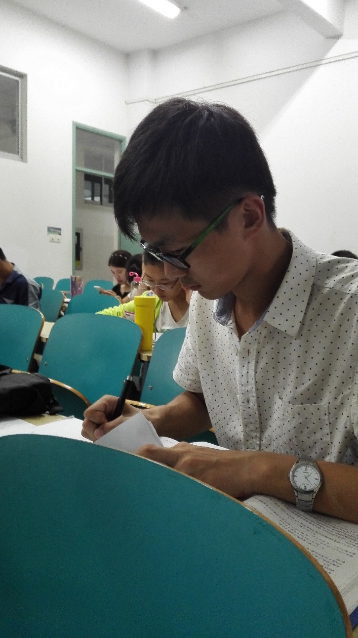 怀揣梦想的他并没有自暴自弃,挫折后他更知学习的重要性,他说暂时落后并不可怕,只要能够及时调整自我,克服困难,就有迎头赶上的机会。他开始调整学习方法,合理分配时间精力。他放弃了不多的休息时间,把所有闲暇时间都用在学习上,把别人玩手机睡觉的心思放在书本上,把别人看电影玩游戏时间泡在图书馆里。他每天认真上课,完成其他工作后,晚上选择在图书馆奋战到深夜,几乎每天都陪伴着闭馆的提示收拾书包。日复一日的积累和坚持让他的内心变得强大,成绩得到提升。
