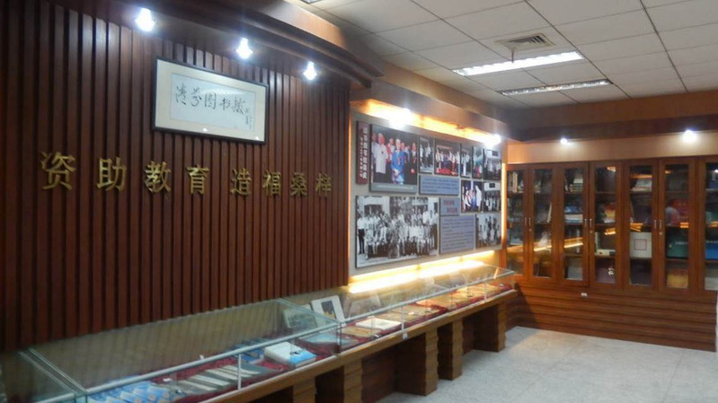 嘉兴一中清芬图书馆钱正英捐书室,镜框内为钱正英所题“清芬图书馆”。