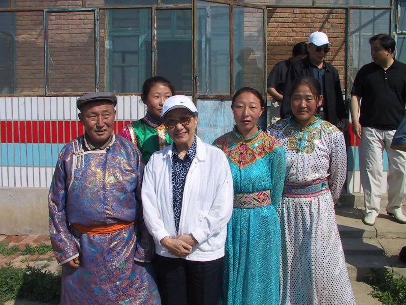 2003年7月,钱正英再赴内蒙,看到生态环境初步恢复、农牧民生活得到改善,高兴地与蒙古族农牧民合影。